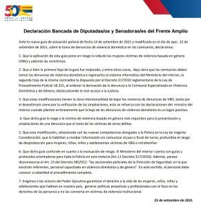 Según el FA, el nuevo protocolo, sumado a las competencias que le otorga la Ley de Urgente Consideración (LUC) a la Policía, que la habilita a recabar información sin comunicar al juez o fiscal de turno, «profundiza el riesgo de desprotección para mujeres, niñas, niños y adolescentes que habitan en nuestro país víctimas de VBG e intrafamiliar».