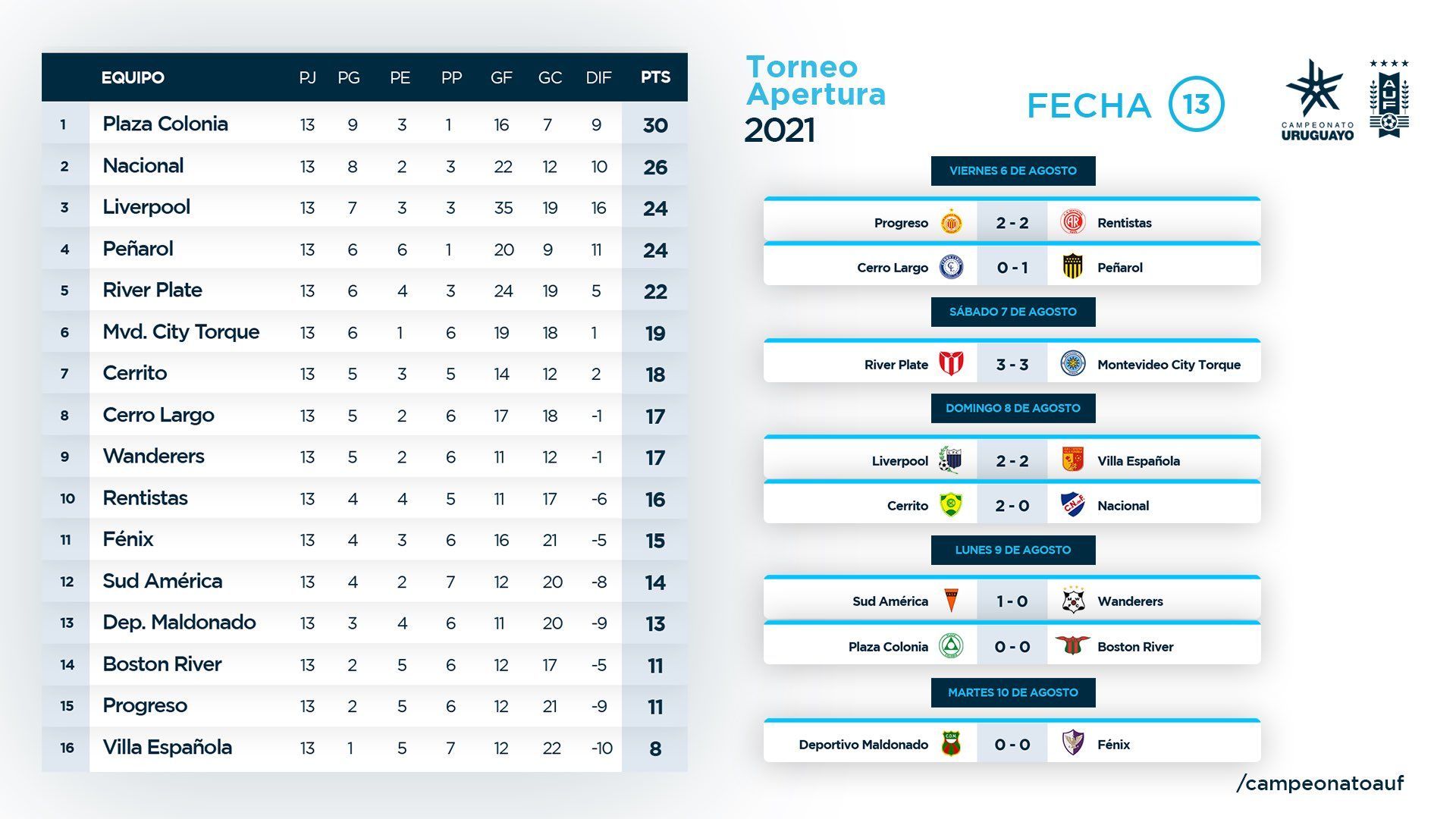 Deportivo Maldonado y Fénix cerraron la 13ra fecha en un empate sin goles; en la próxima fecha se destacan los partidos de Nacional con Liverpool y Plaza con Wanderers, donde de ganar los colonienses se consagran campeones del Apertura.