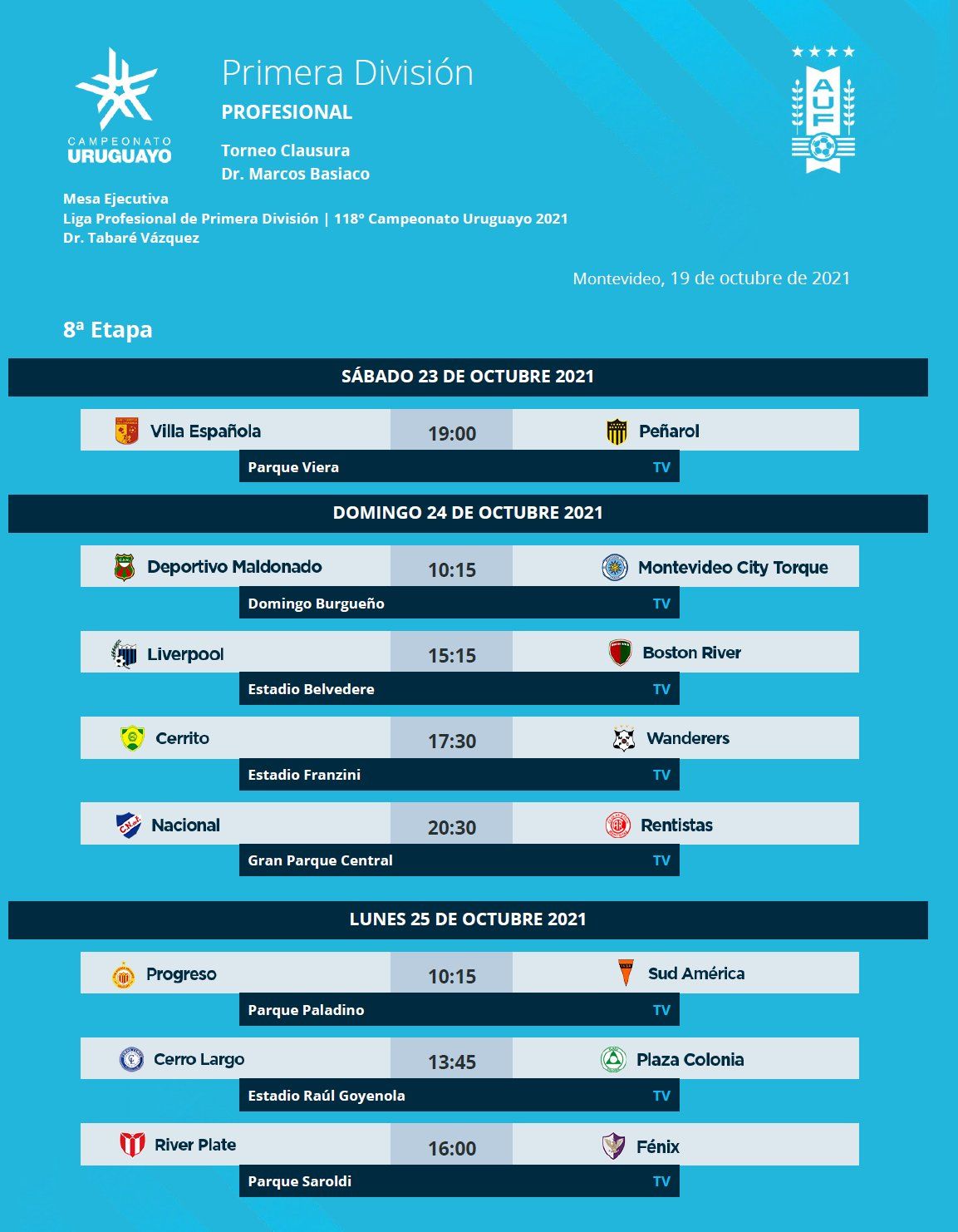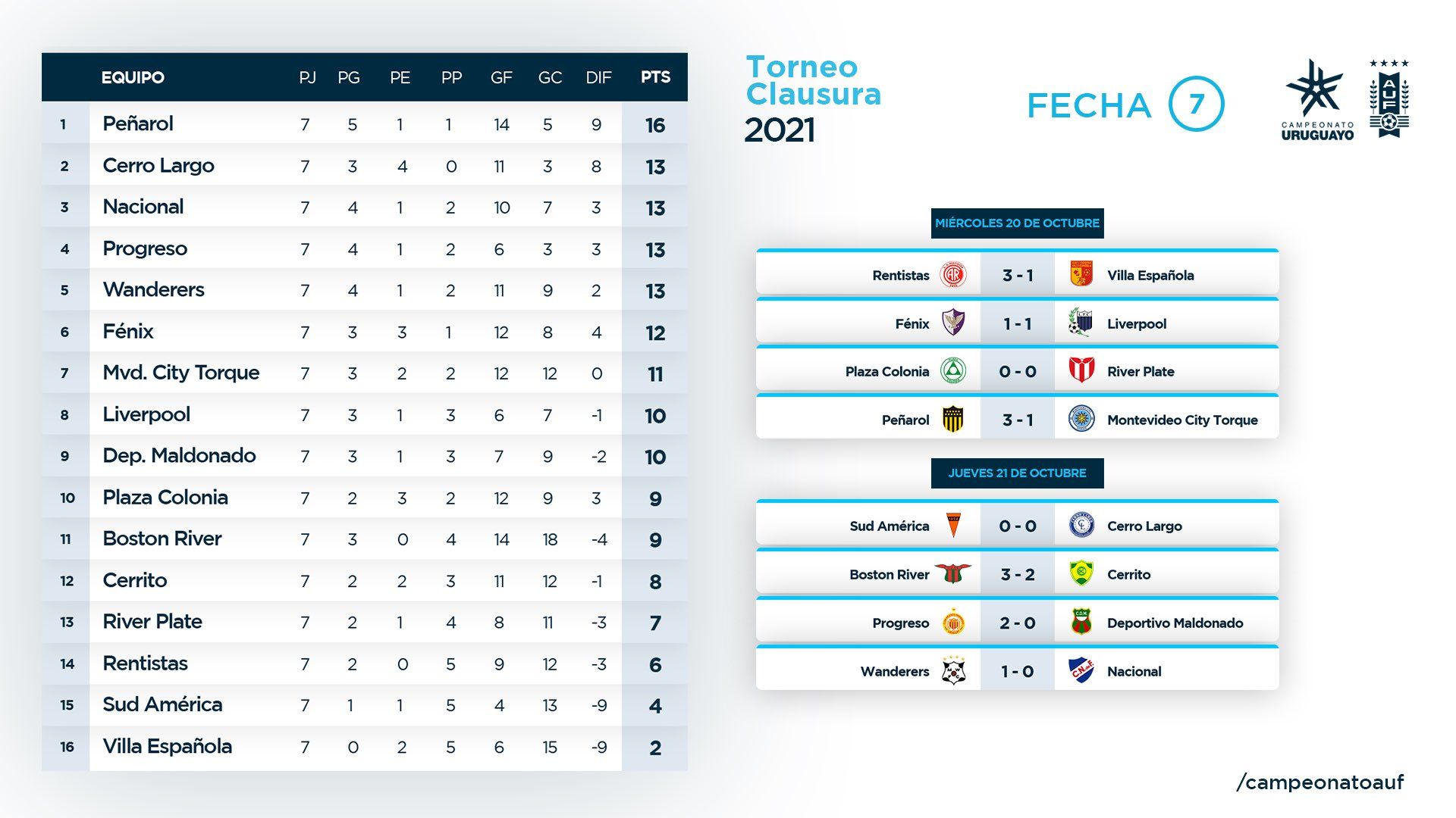 Nacional 111 (1.881), Peñarol 109 (1,847), Liverpool 102 (1,729), Torque 97 (1,644), Plaza 91 (1.542), Cerro Largo 83 (1,407), Fénix 82 (1,390), River 82 (1,390), Wanderers 82 (1,390), Cerrito 27 (1,227), Deportivo Maldonado 70 (1,886), Rentistas 69 (1,169), Boston River 63 (1,068), Progreso 62 (1,051), Sud América 22 (1.000) y Villa Española 11 (0,500)