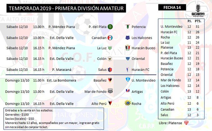 La Primera Amateur fijó la décimocuarta fecha del Apertura, en la que el puntero, Uruguay Montevideo se enfrentará a Basáñez de visita.