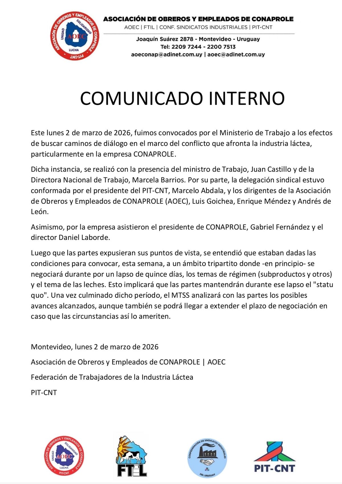 La Asociación de Obreros y Empleados de Conaprole (AOEC) informó este martes en un comunicado que durante la jornada de ayer, el sindicato fue convocado por el Ministerio de Trabajo y Seguridad Social (MTSS) para "buscar caminos de diálogo" en el marco del conflicto que afecta a la industra lactea y, en particular, a la empresa Conaprole