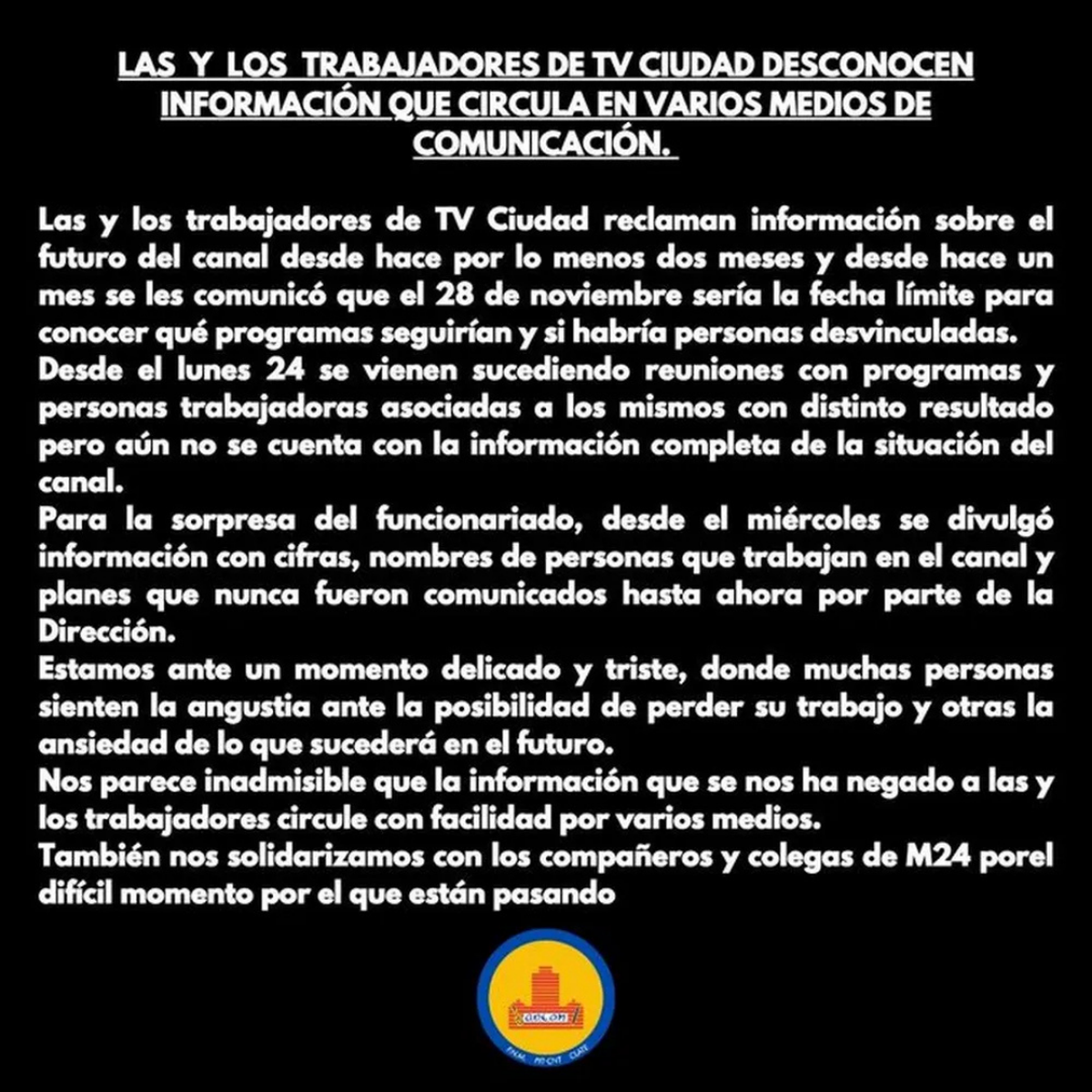 El sindicato de TV Ciudad afirmó que permanece “en alerta” a la espera de la confirmación formal de los cambios para evaluar medidas. En paralelo, expresó su solidaridad con los equipos de M24, que atraviesan también un momento crítico tras confirmarse el cierre y el despido de la totalidad de la plantilla.