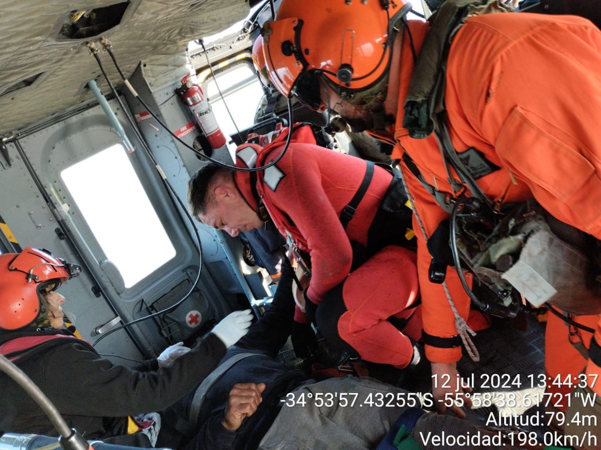 Sobre las 13 hs., un helicóptero logró estabilizar la aeronave sobre el buque pesquero, para trasladar al marinero hacia el Hospital Policial.