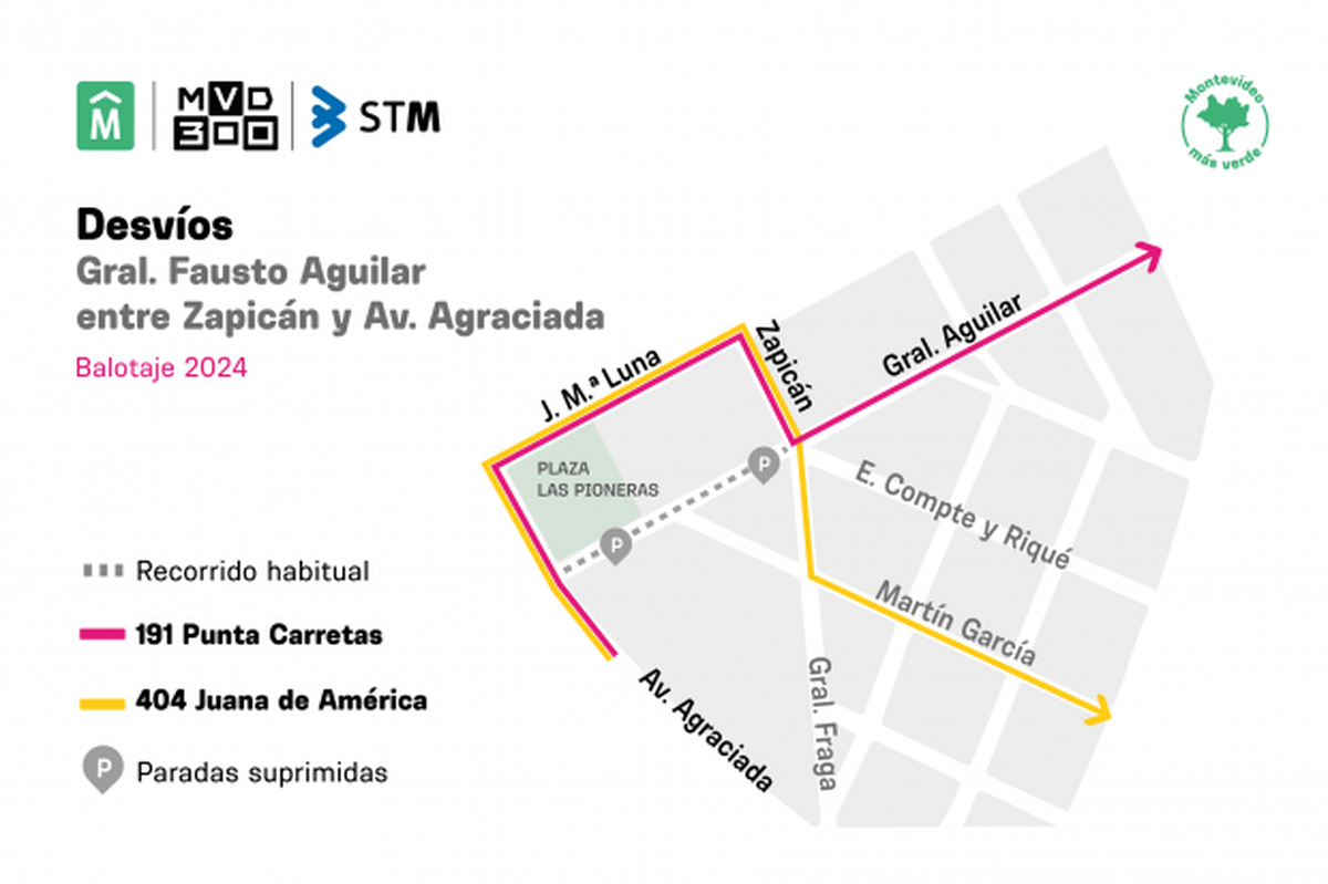 Por la misma razón regirá un corte de tránsito en la calle General Fausto Aguilar entre Avenida Agraciada y Martín García desde la hora 19 del domingo hasta las 02.00 del lunes. Por tal motivo, las líneas 191 (Pta. Carretas) y 404 (Juana de América) desviarán de la siguiente forma: Av. Agraciada – J. M.ª. Luna – Zapicán.
