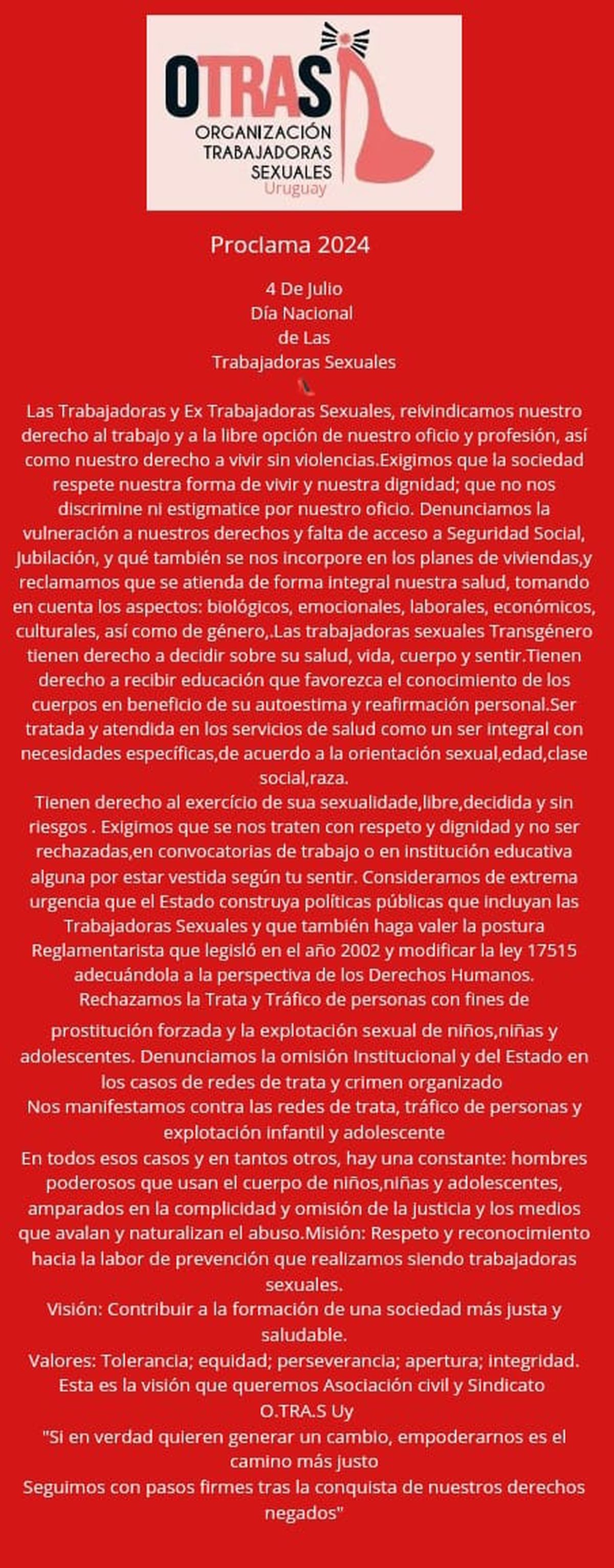 La proclama concluyó con una llamada a la acción: "Si en verdad quieren generar un cambio, empoderarnos es el camino más justo. Seguimos con pasos firmes tras la conquista de nuestros derechos negados".