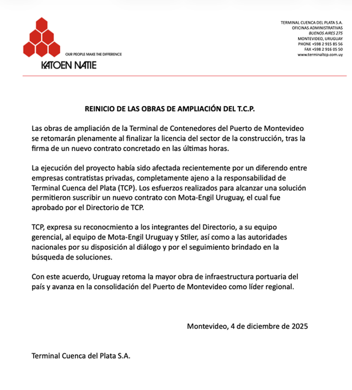 Un diferendo entre empresas mantenía paralizadas las obras en el puerto de Montevideo; este jueves Katoen Natie anunció que se llegó a un acuerdo.