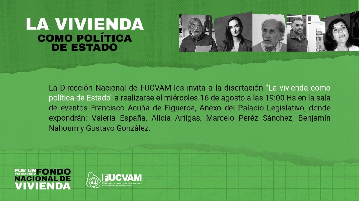 Entendiendo que al país le sigue haciendo falta una definición sobre una política pública de vivienda, FUCVAM realiza una panel a las 19 horas de hoy en el edificio anexo del Palacio Legislativo.