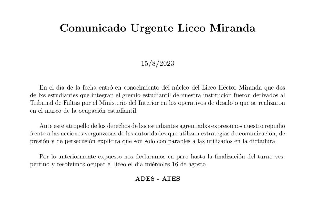 A través del documento informan que dos de los estudiantes que integran el gremio estudiantil de la institución educativa fueron derivados al Tribunal de Faltas por el Ministerio del Interior en los operativos policiales de desalojo que se realizaron, tras la ocupación estudiantil.