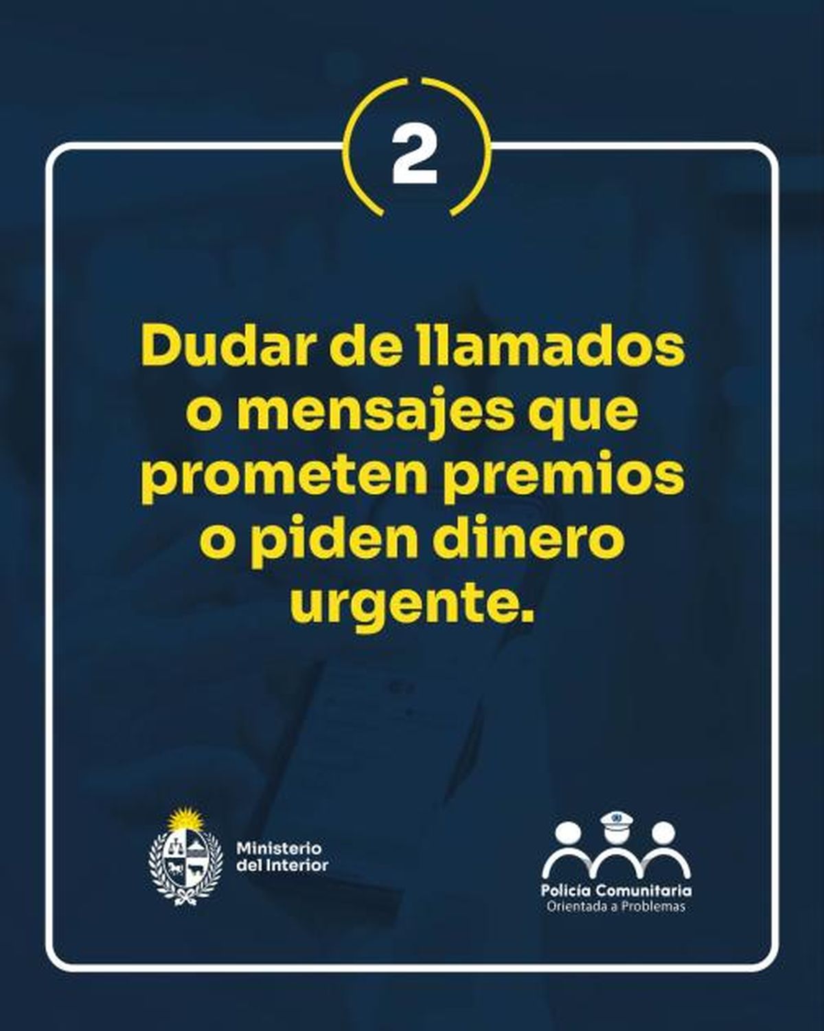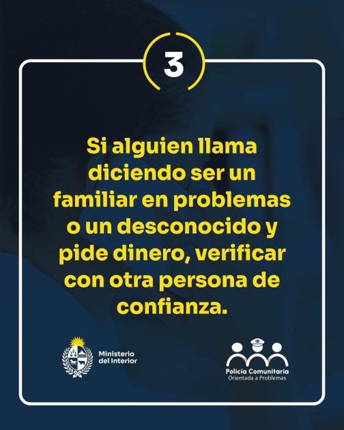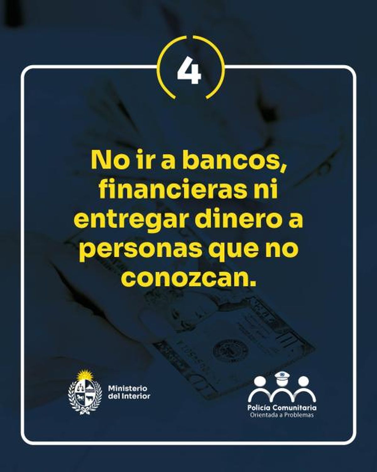El Ministerio del Interior, a través de la PCOP, está llevando a cabo una campaña para prevenir estafas de las que son víctimas los adultos mayores. Esta se desarrolla a lo largo del país e implica una estrategia integral de abordaje a dicho delito, incluyendo interacción con la sociedad civil, con instituciones públicas y privadas.