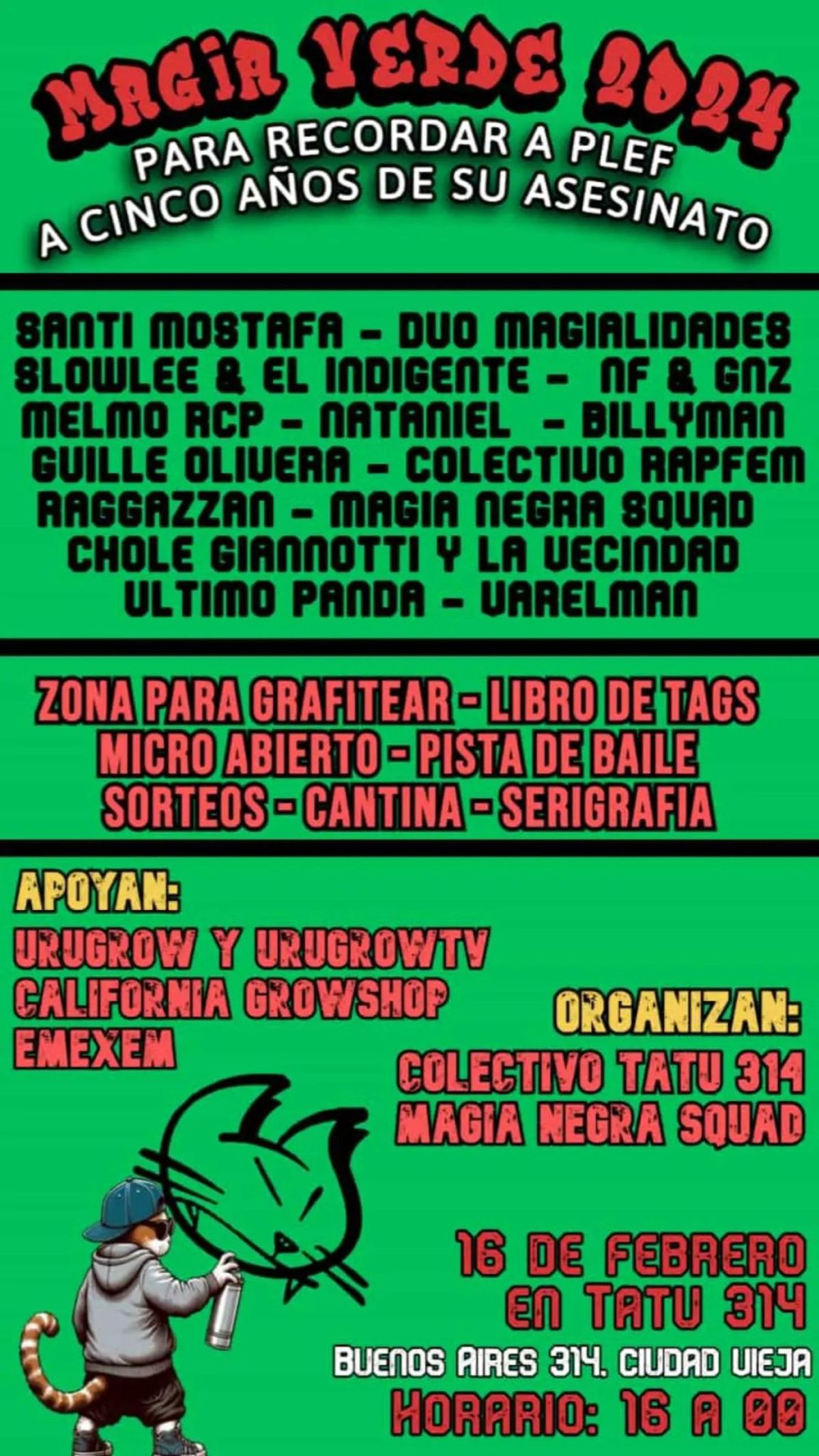 Este 16 de febrero los muros se volverán a pintar con el gato de Plef, Larbanois & Carrero entonará la canción que compusieron en su homenaje, una estación que lleva su nombre estará alerta ante un posible movimiento sísmico, el grupo de hip hop Magia Negra, al que pertenecía Plef, hará un nuevo recital en su memoria.