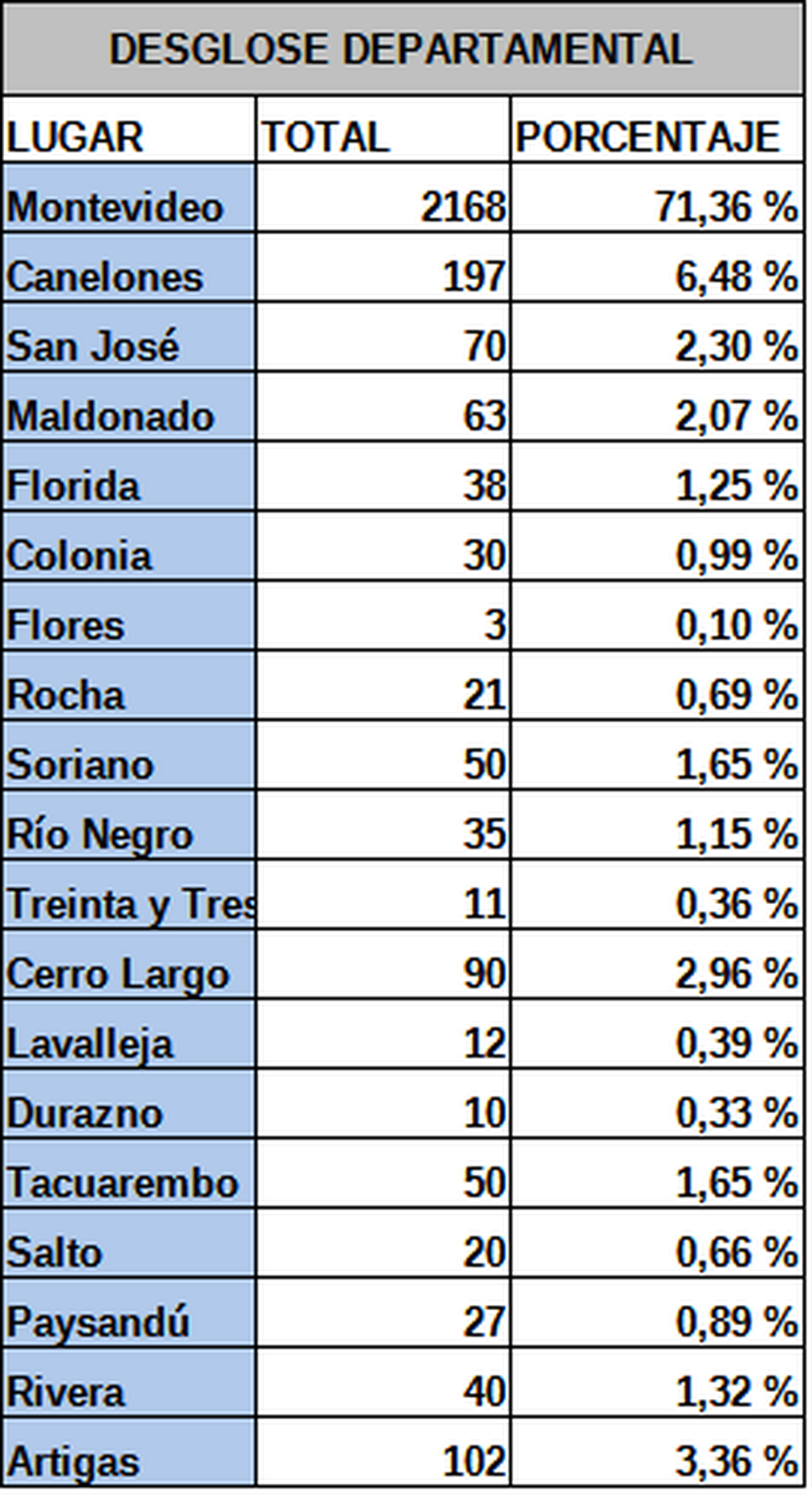 En Montevideo se registran la mayoría de los casos 71,36% (2168) y el resto en el interior 870 (28,64%).