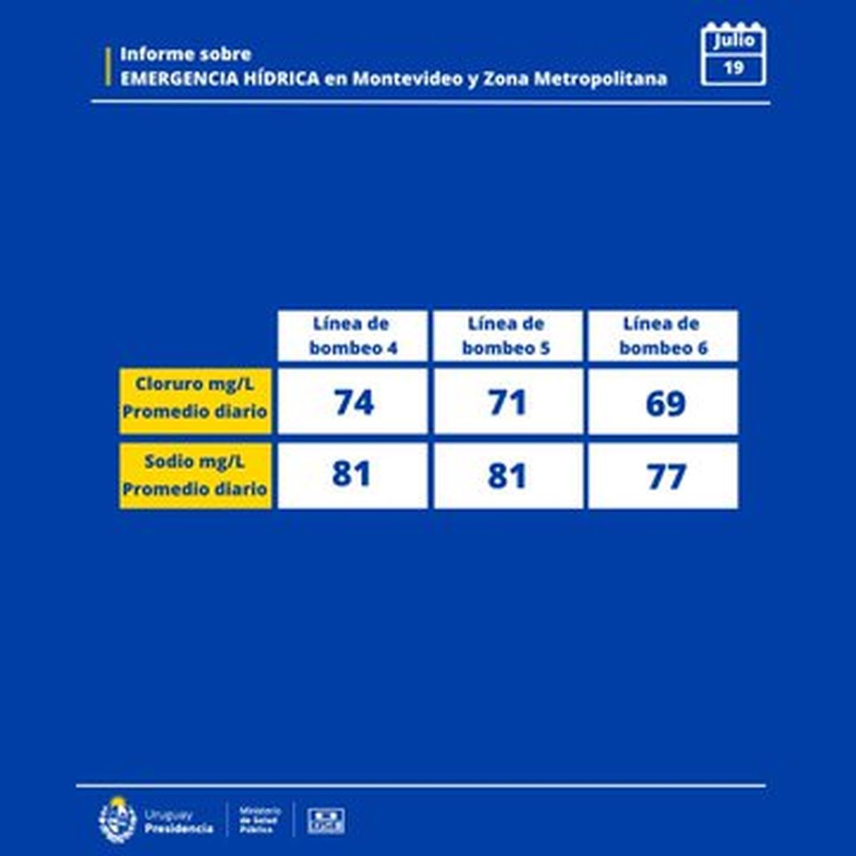 Señala el informe dado a conocer por la Administración de Obras Sanitarias del Estado (OSE) y el Ministerio de Salud Pública (MSP), los niveles promedio de sodio y de cloruro se ubican por debajo de 100 miligramos por litro (mg/l).