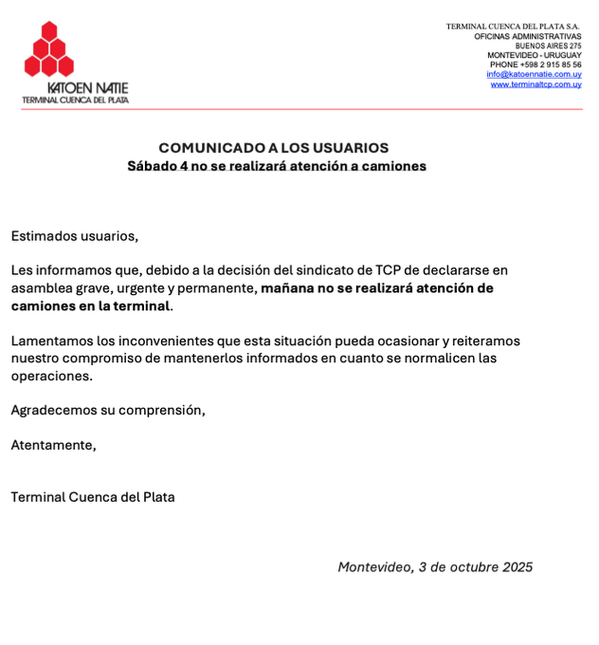 Terminal Cuenca del Plata (TCP), operadora de la playa de contenedores del puerto de Montevideo, anunció que a consecuencia de medidas gremiales dispuestas por el sindicato, este sábado "no se realizará atención de camiones en la terminal".