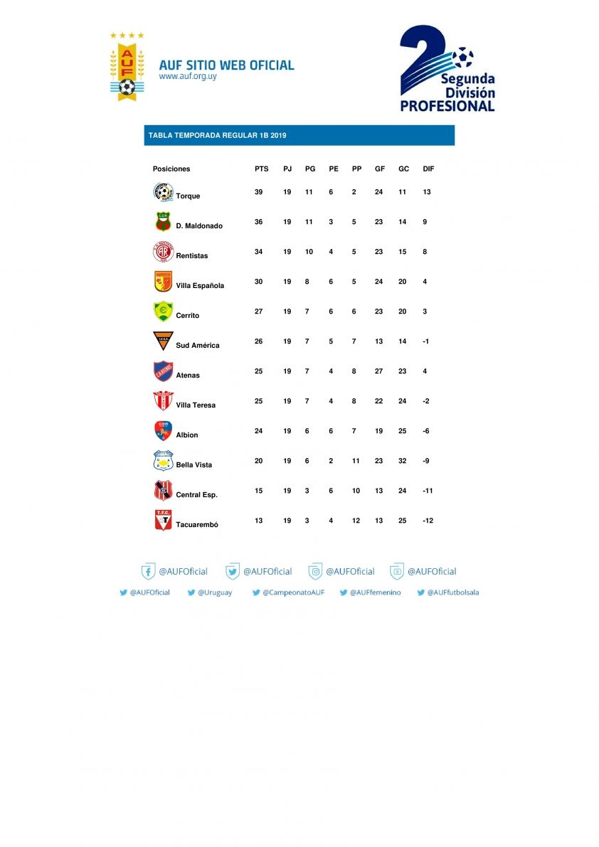 Hay dos ascensos directos que en este momento son para Torque (39) y Deportivo Maldonado (36), con Rentistas (34) muy cerca.