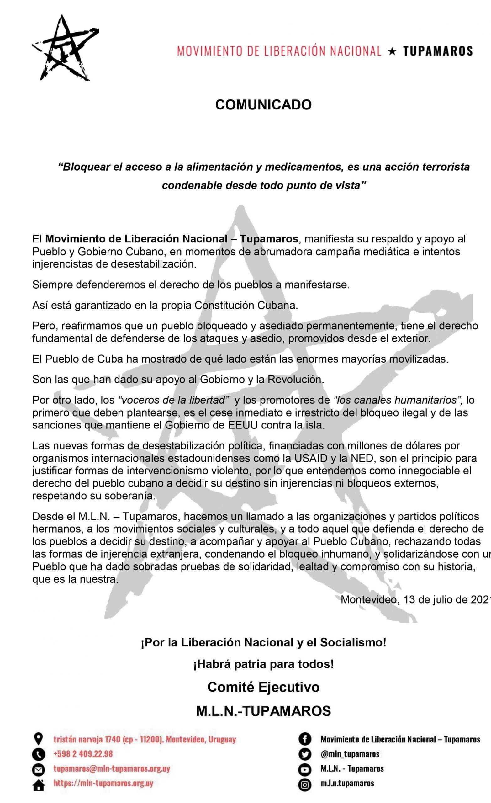 El Movimiento de Liberación Nacional-Tupamaros (MLN-T) manifestó su apoyo “al pueblo y al gobierno cubano”, “en momentos de abrumadora campaña mediática e intentos injerencistas de desestabilización”.