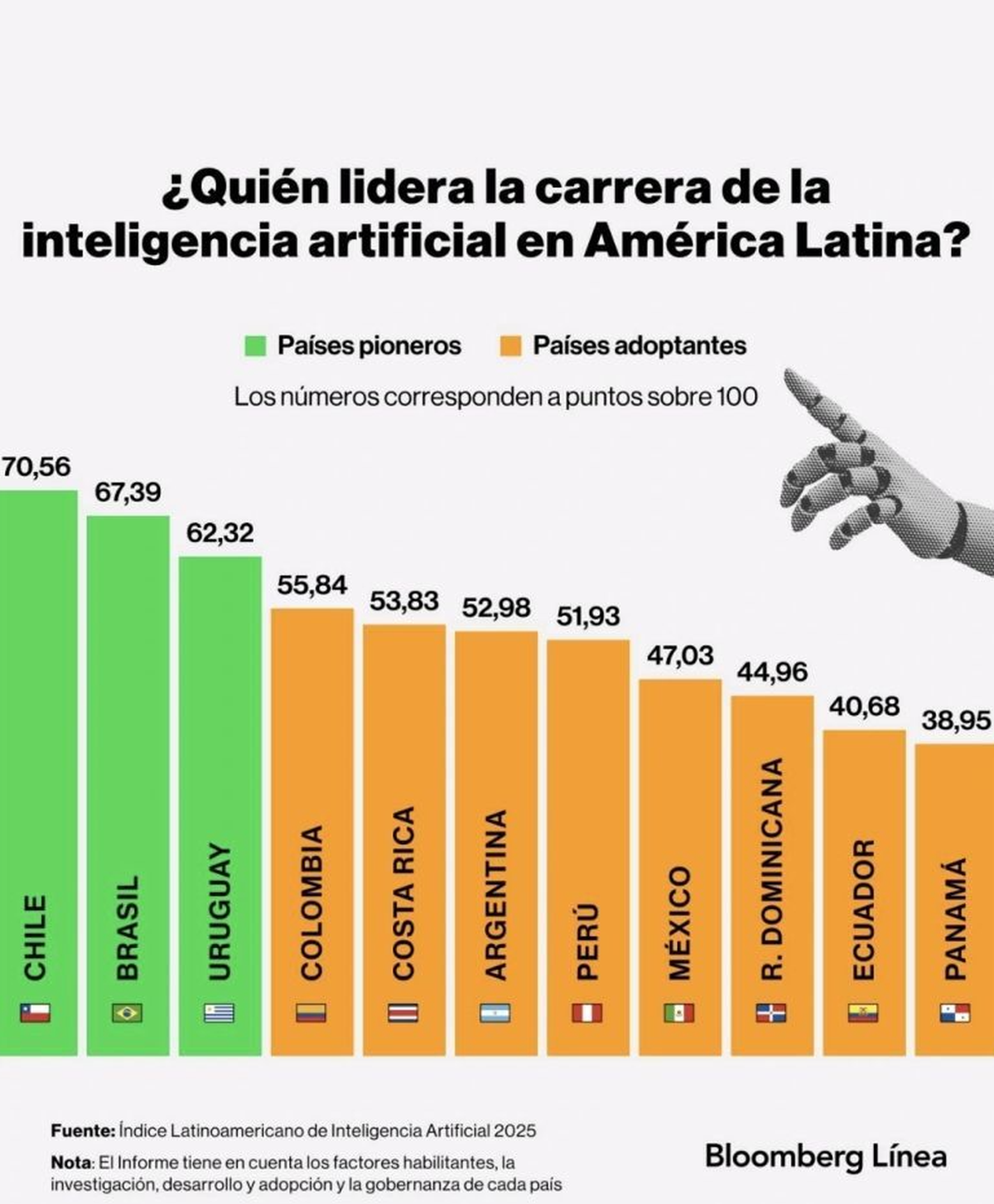 Según el reciente Índice Latinoamericano de Inteligencia Artificial, Uruguay se posiciona en el tercer lugar en la región, con un puntaje de 62.75. Este destacado lugar responde a un contexto en el que Chile lidera la carrera con un puntaje de 70.56, seguido de Brasil con 62.32. La relevancia de este índice ha sido subrayada por Bloomberg, que resalta la creciente importancia de la inteligencia artificial (IA) en el desarrollo económico y social de los países latinoamericanos.