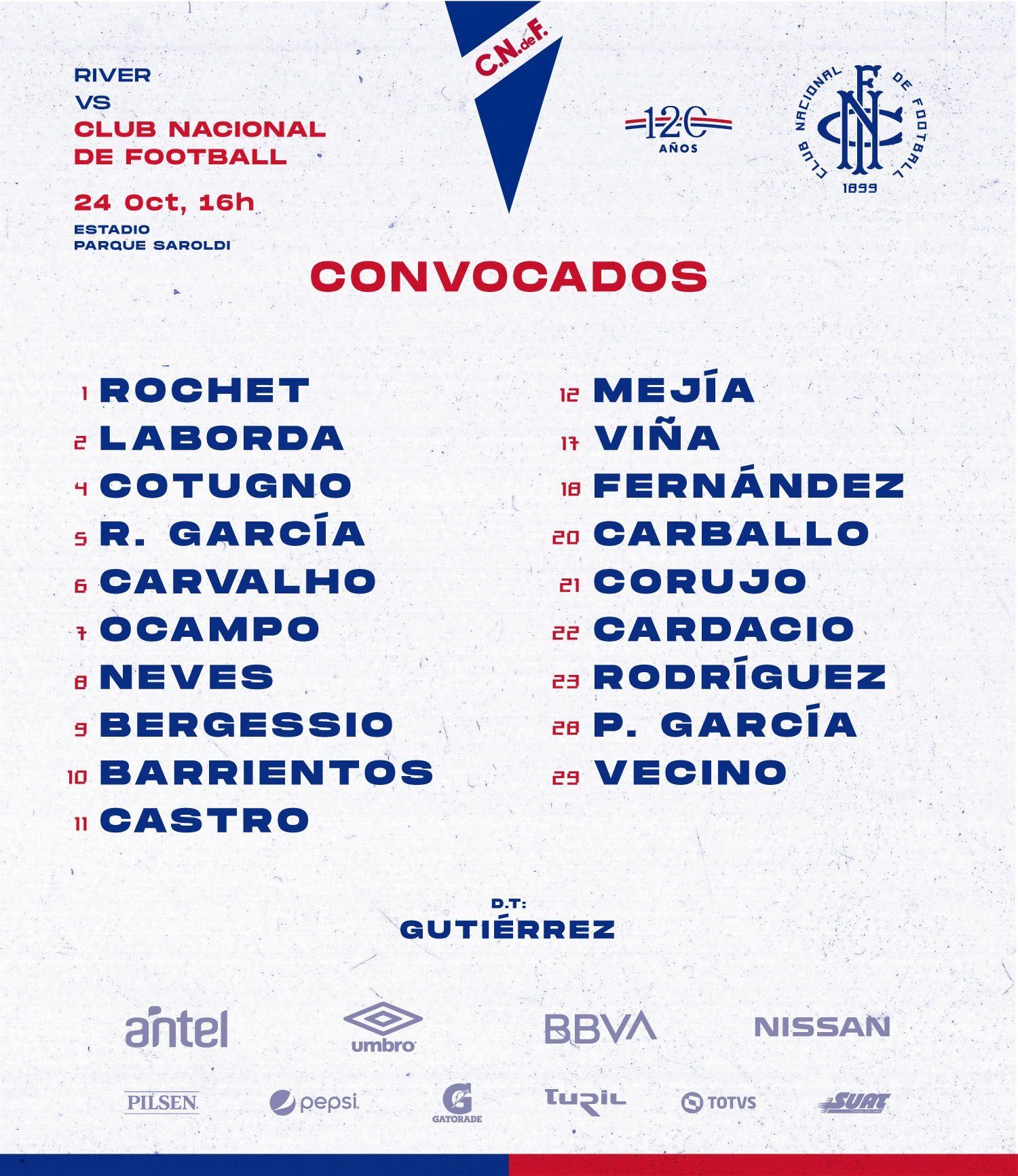 El equipo para visitar a River formará con: Luis Mejía; Guillermo Cotugno, Guzmán Corujo, Felipe Carvalho y Matías Viña; Gabriel Neves, Rafael García y Felipe Carballo; Brian Ocampo, Gonzalo Bergessio y Gonzalo Castro.